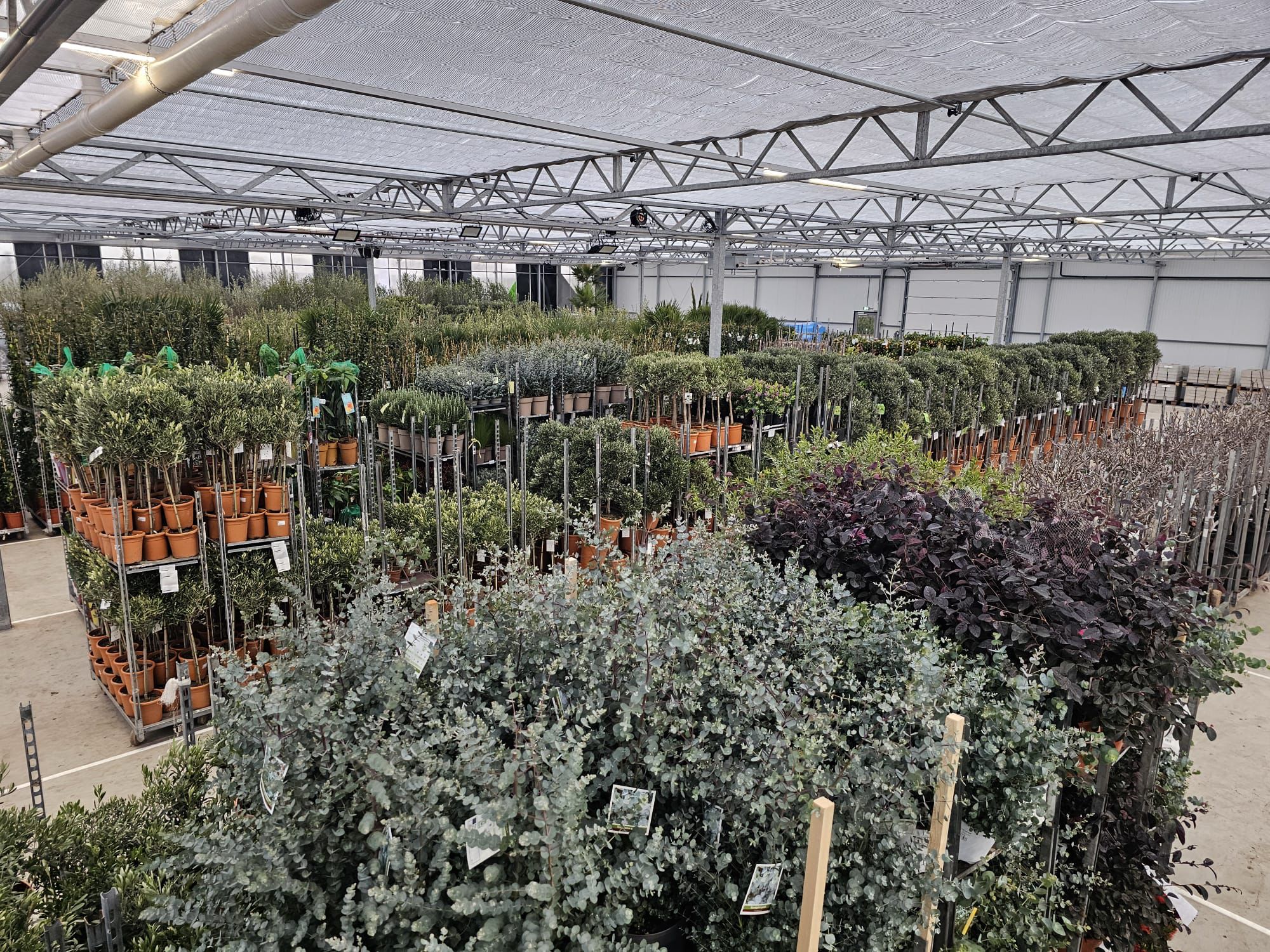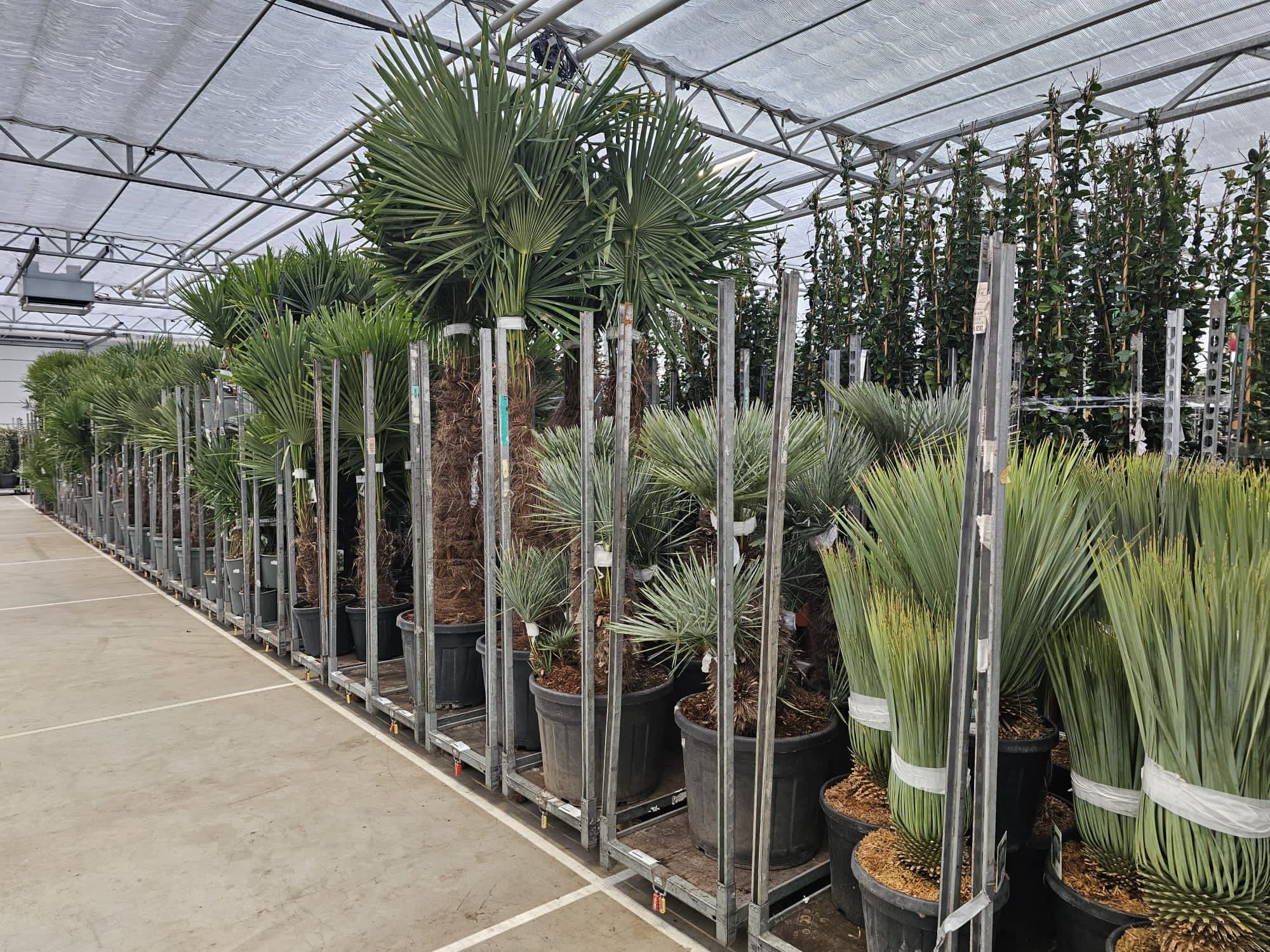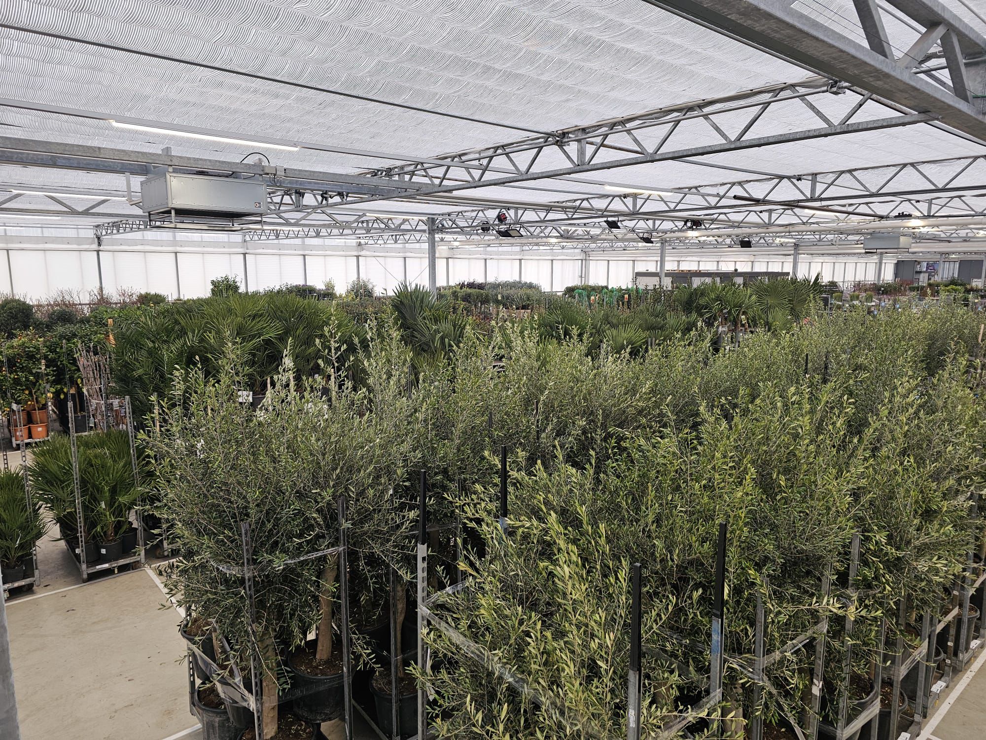 Unter anderem mit Nerium, Trachycarpus und Oliven in verschiedenen Topfgrößen.