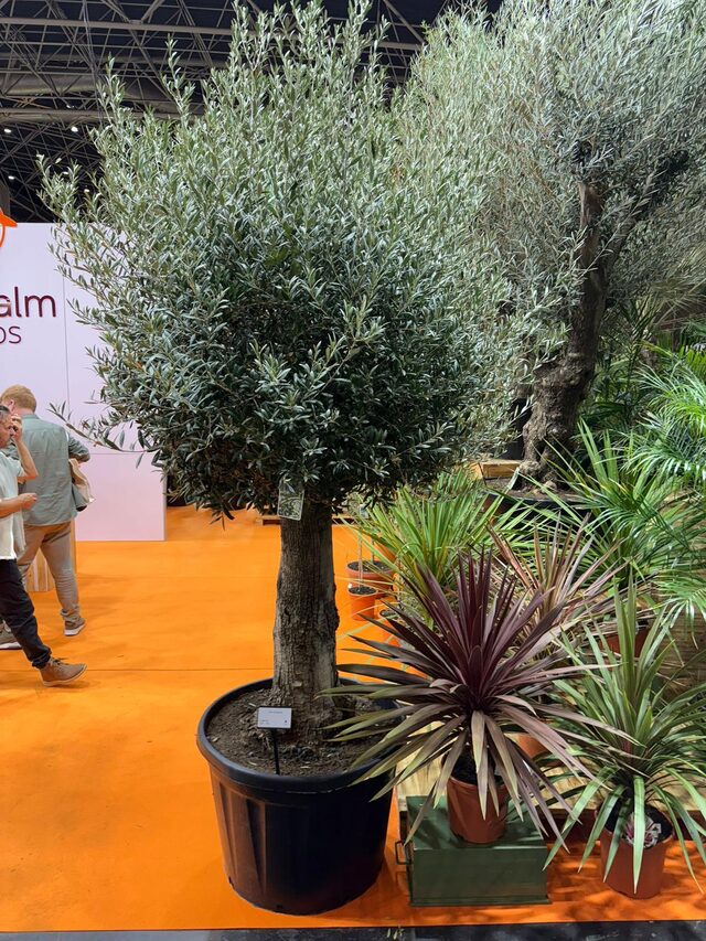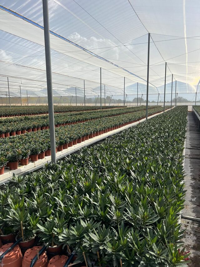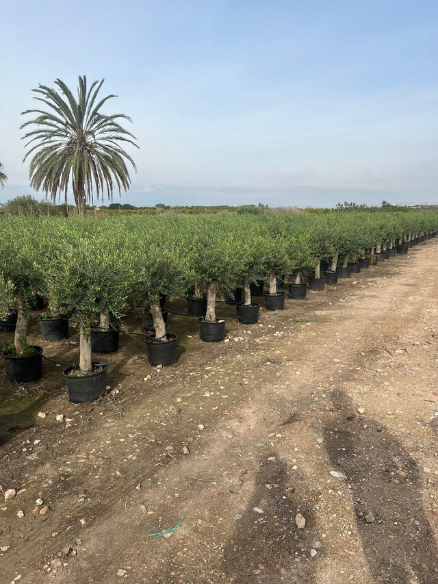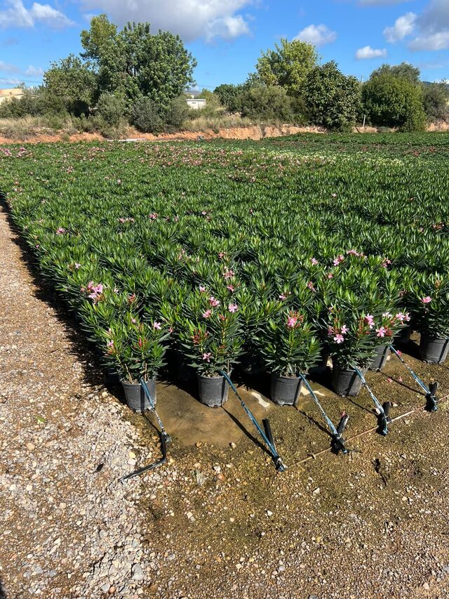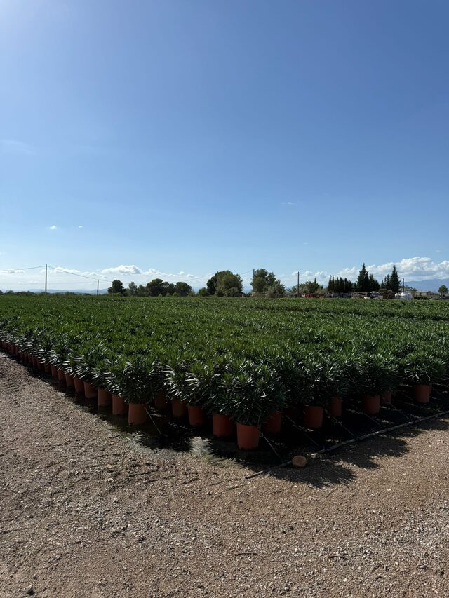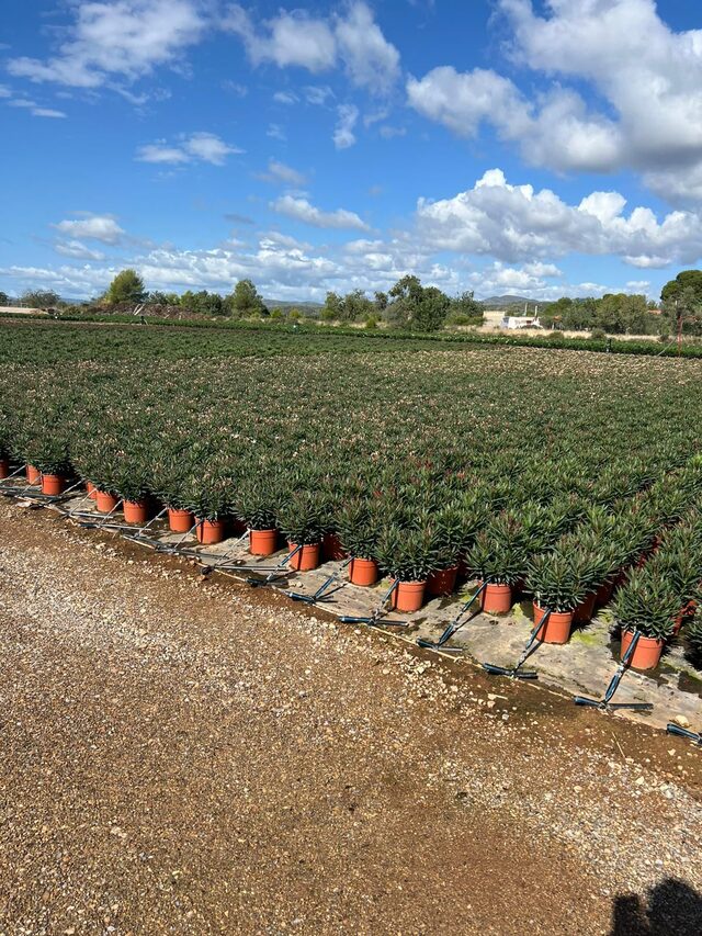 Met onder andere Nerium, Trachycarpus en olijven in diverse potmaten