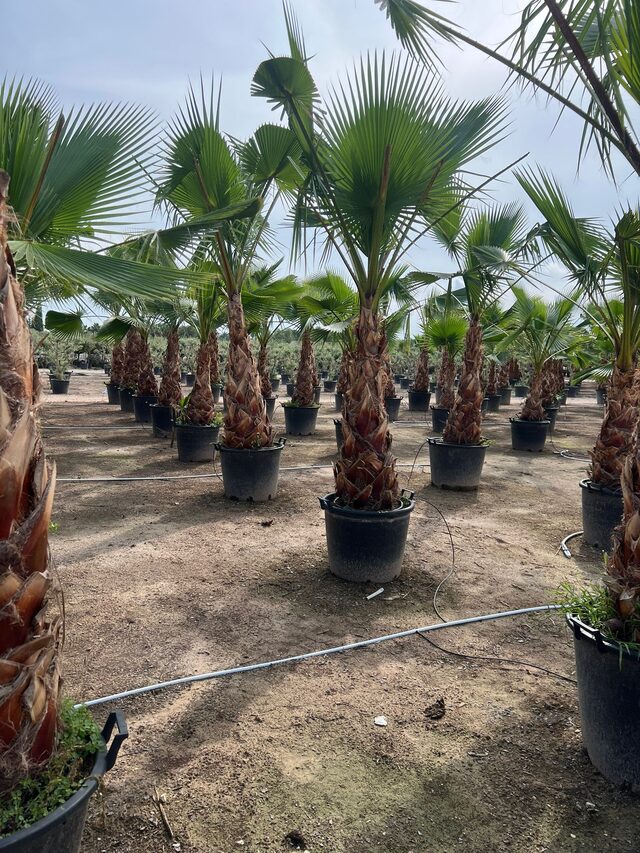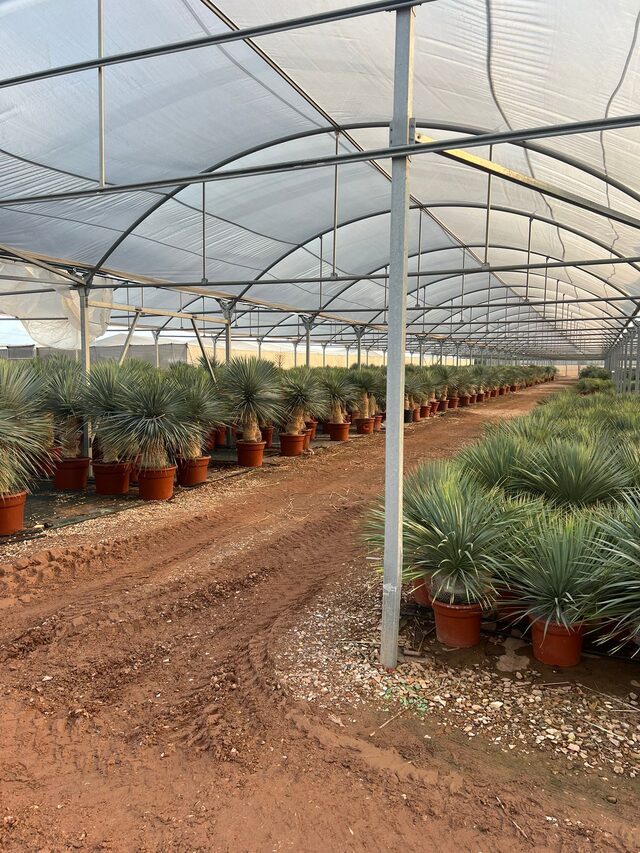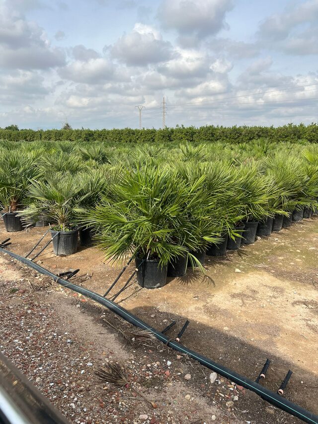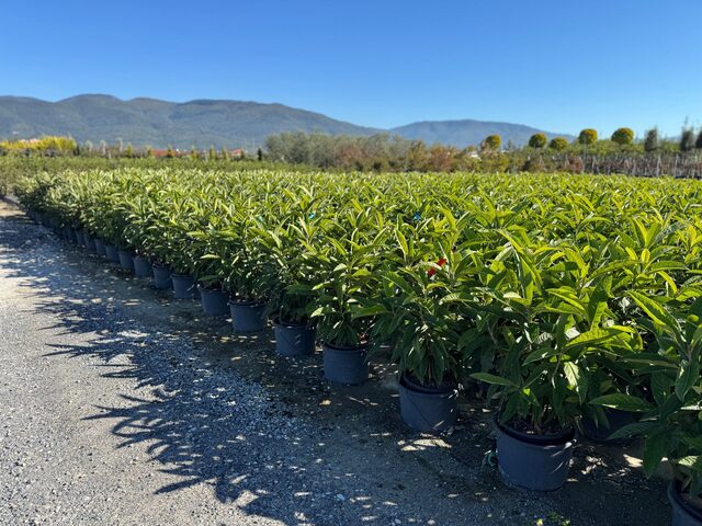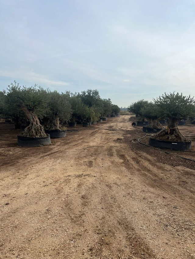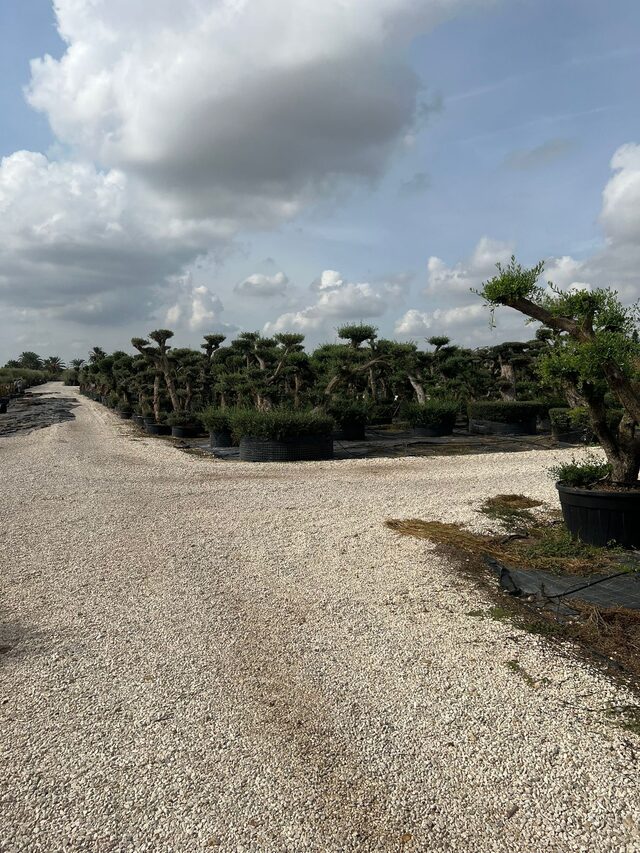 Met onder andere Nerium, Trachycarpus en olijven in diverse potmaten